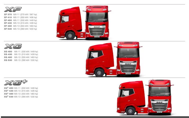 DAF postavlja povsem nov standard s povsem novo ponudbo tovornjakov. Novi XF, XG in XG+ ponujajo najvišjo kakovost, popolnoma novo aerodinamično oblilko,10% izboljšano porabo goriva, celoten nabor pasivnih in aktivnih varnostnih funkcij ter naslednjo stopnjo razkošja pri oblikovanju tovornjakov. Evropska komisija je uvedla nove predpise o masah in dimenzijah z namenom, da premakne meje glede emisij (CO2), prometne varnosti in udobja voznika.